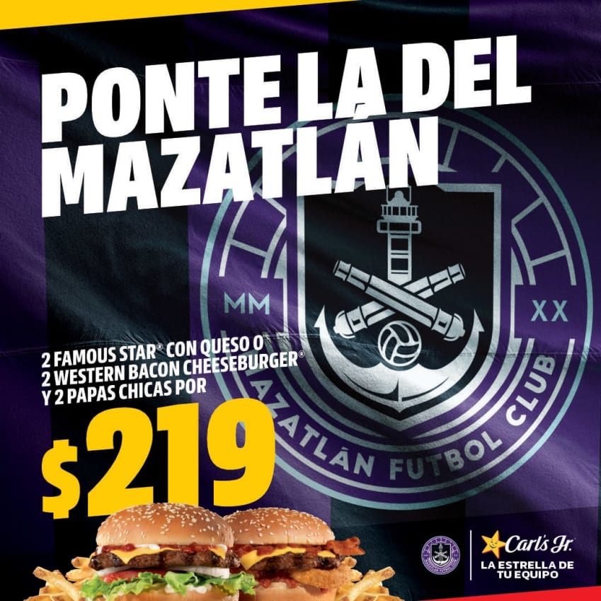 Visita tu Carl’s Jr.® favorito con el jersey o cualquier camiseta de Mazatlán F.C. y llévate, a escoger, 2 Famous Star® con Queso o 2 Western Bacon Cheeseburger®, más 2 papas chicas por solo $219 pesos. ¡Ponte la camiseta en Carl’s Jr.®, la estrella de tu equipo! Con Carl’s Tod@s Somos Mazatlán FC.